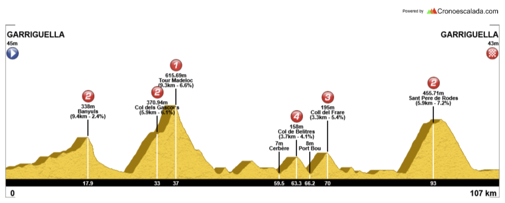 RECORREGUT: Garriguella, Espolla, Coll de Banyuls (8,7 qm./2,3%), Mas Reig, Tour de Madeloc (9,5 qm./6,76%, pero desde desvío a la torre 1,74 km./11,3% con 19% máx.), Port-Vendres, Banyuls, Cerbère, Coll dels Belitres, Port Bou, Col del Frare, Valleta, Puerto de la Selva, Sant pere de Rodes (5,9 qm./7,6% con 16% máx.) i Garriguella